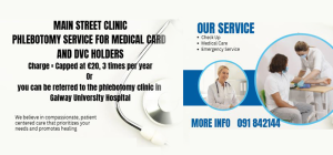 Phlebotomy Service for Medical Card and DVC Holders Charge: Capped at €20, 3 times per year or referral to the phlebotomy clinic in Galway University Hospital At Main Street Clinic, we believe in compassionate, patient centered care that prioritises your needs and promotes healing. Our service: For more information contact us at (091) 842144